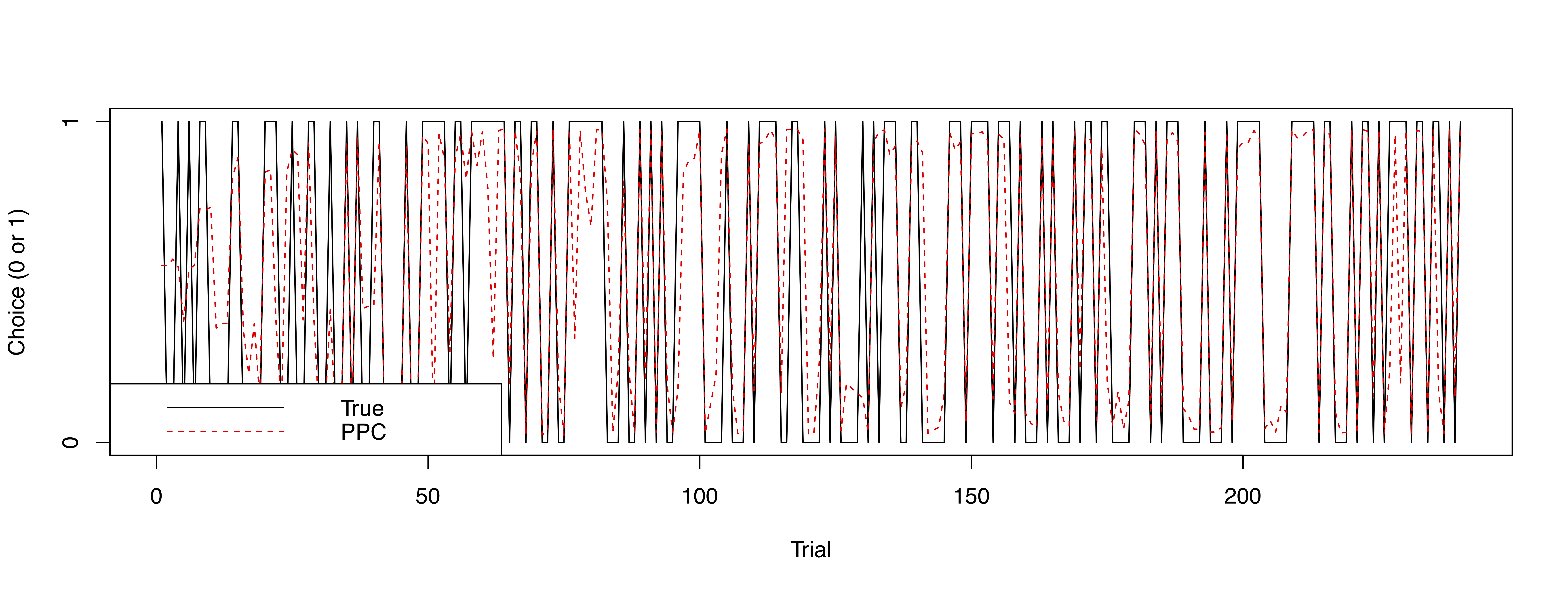 legend("bottomleft", legend=c("True", "PPC"), col=c("black", "red"), lty=1:2)